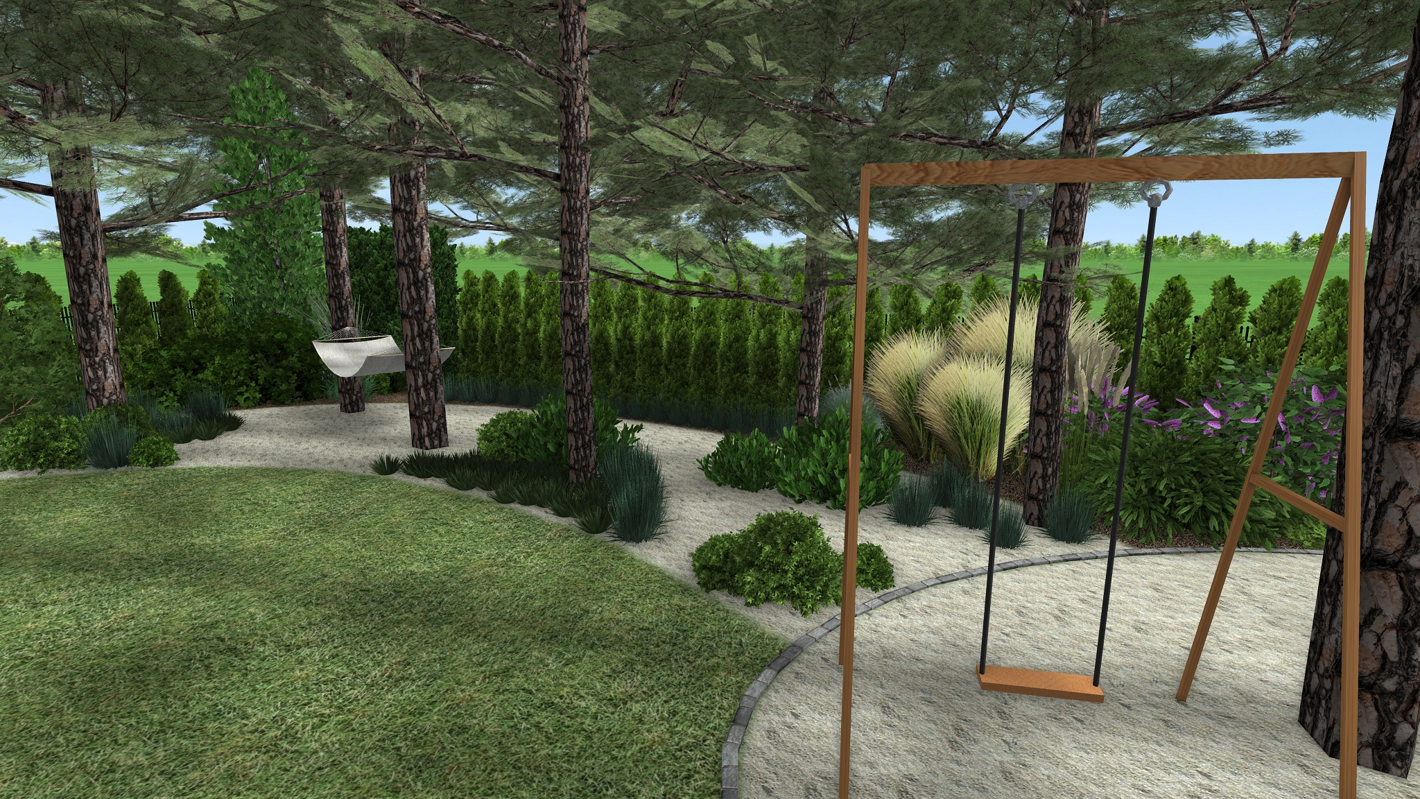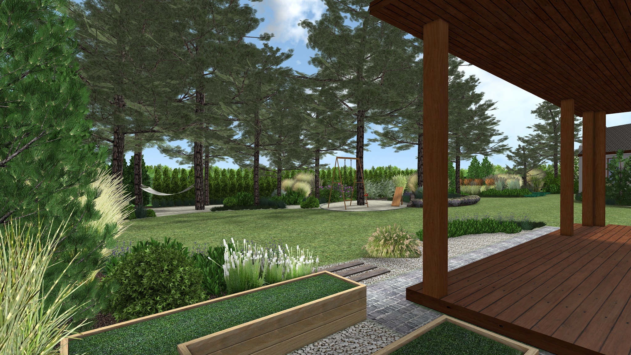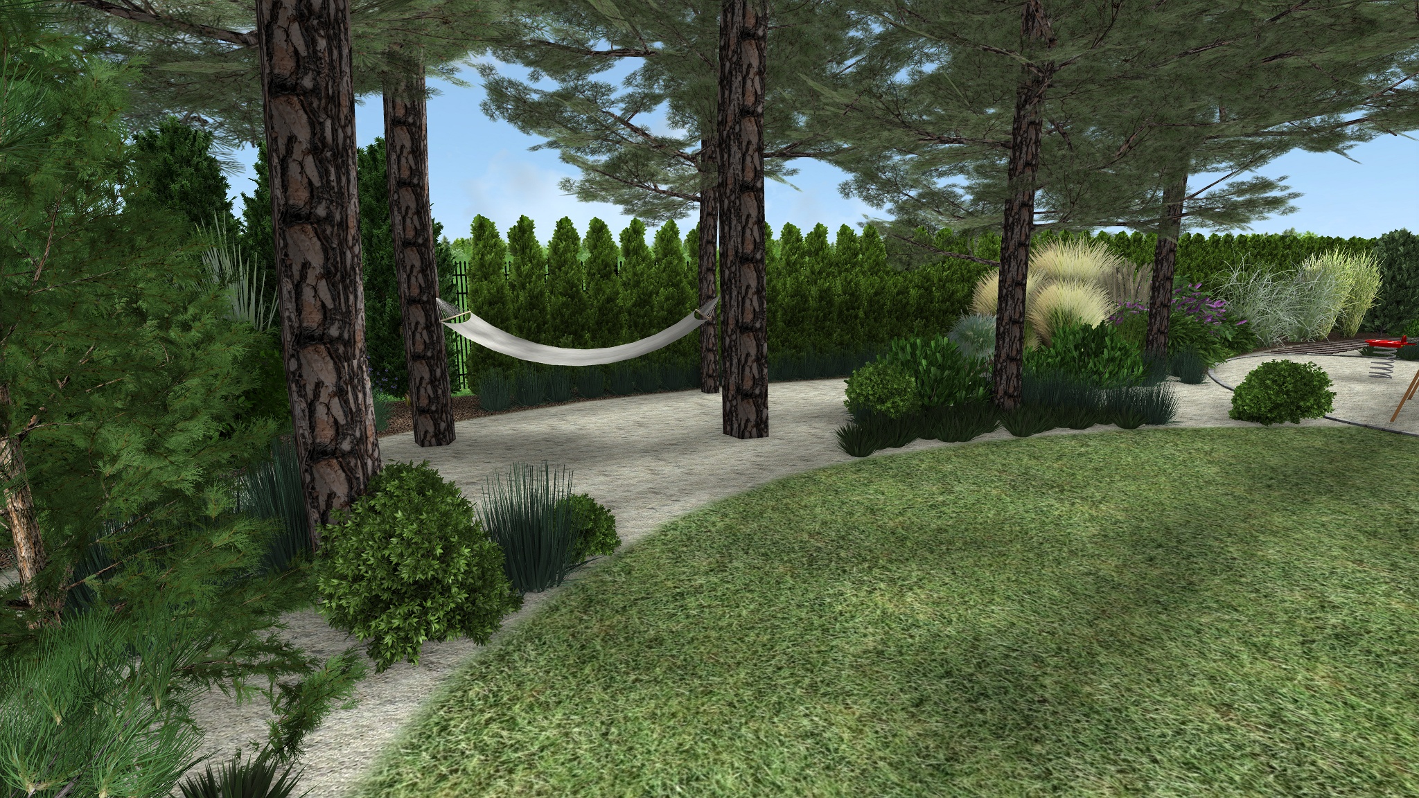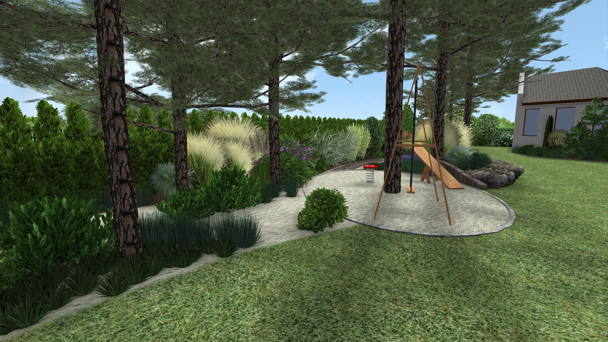 Stávající skupina jehličnanů, prořezaných ve spodní části, byla doplněna skvrnami nižších trav a trpasličích keřů. Povrch cest zde tvoří jemně zrnitý písek, jež do zahrady zavádí lesní atmosféru. Mezi stromy se nachází také houpací síť pro odpočinek ve stínu stromů. Ve stínu borovic je rovněž místo pro oválný prostor vyplněný pískem sloužící k dětským hrám. Prostor obklopují listnaté keře přitahující motýly a jahodníky. Z dětského prostoru směrem ke garáži vede stezka z železničních pražců uložených do jemného písku doplněného kompozicí tří větších kamenů.