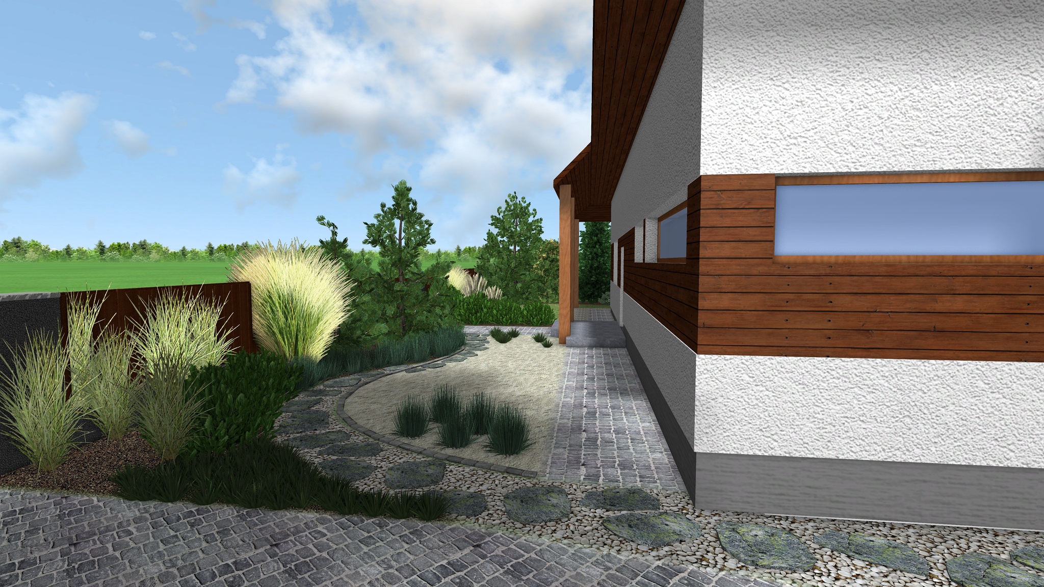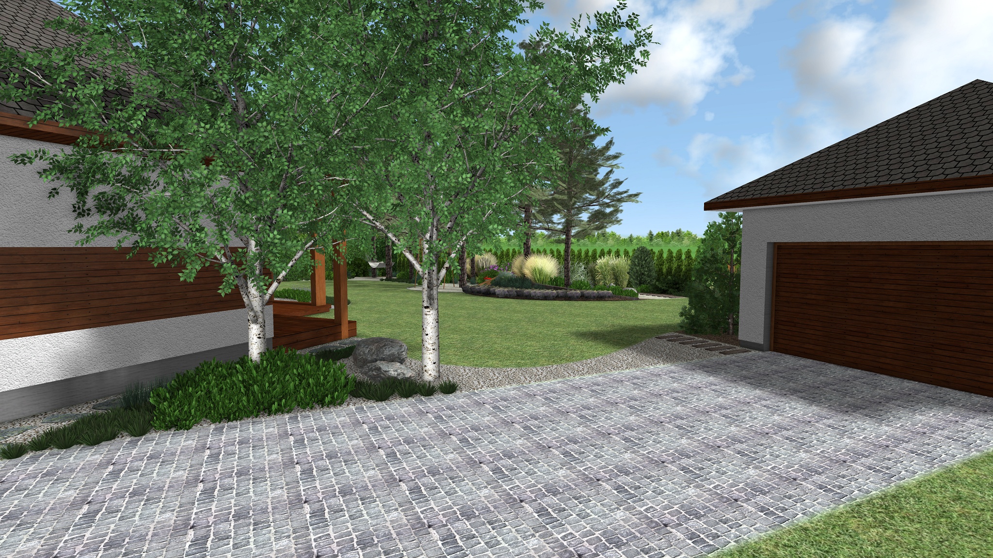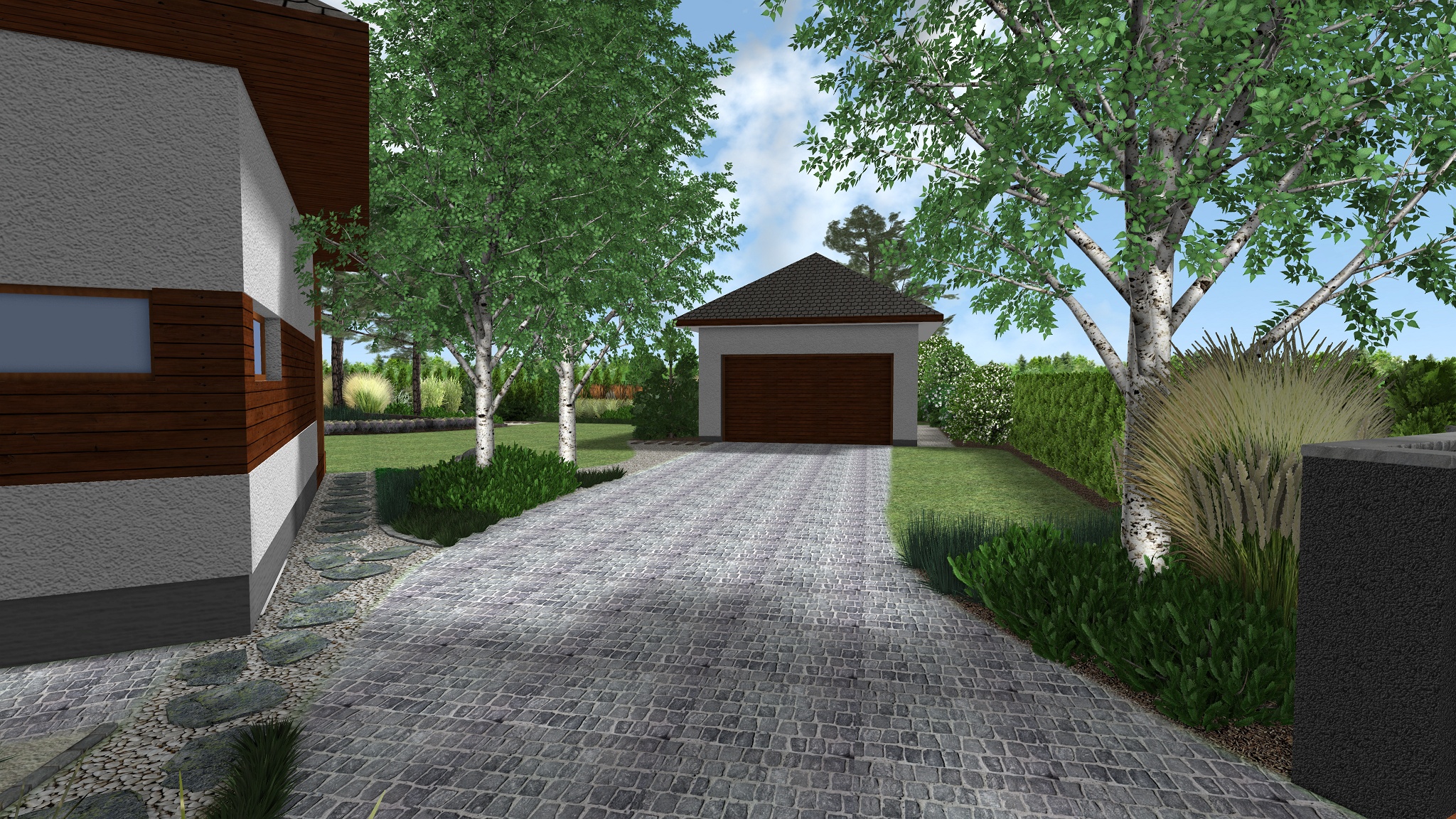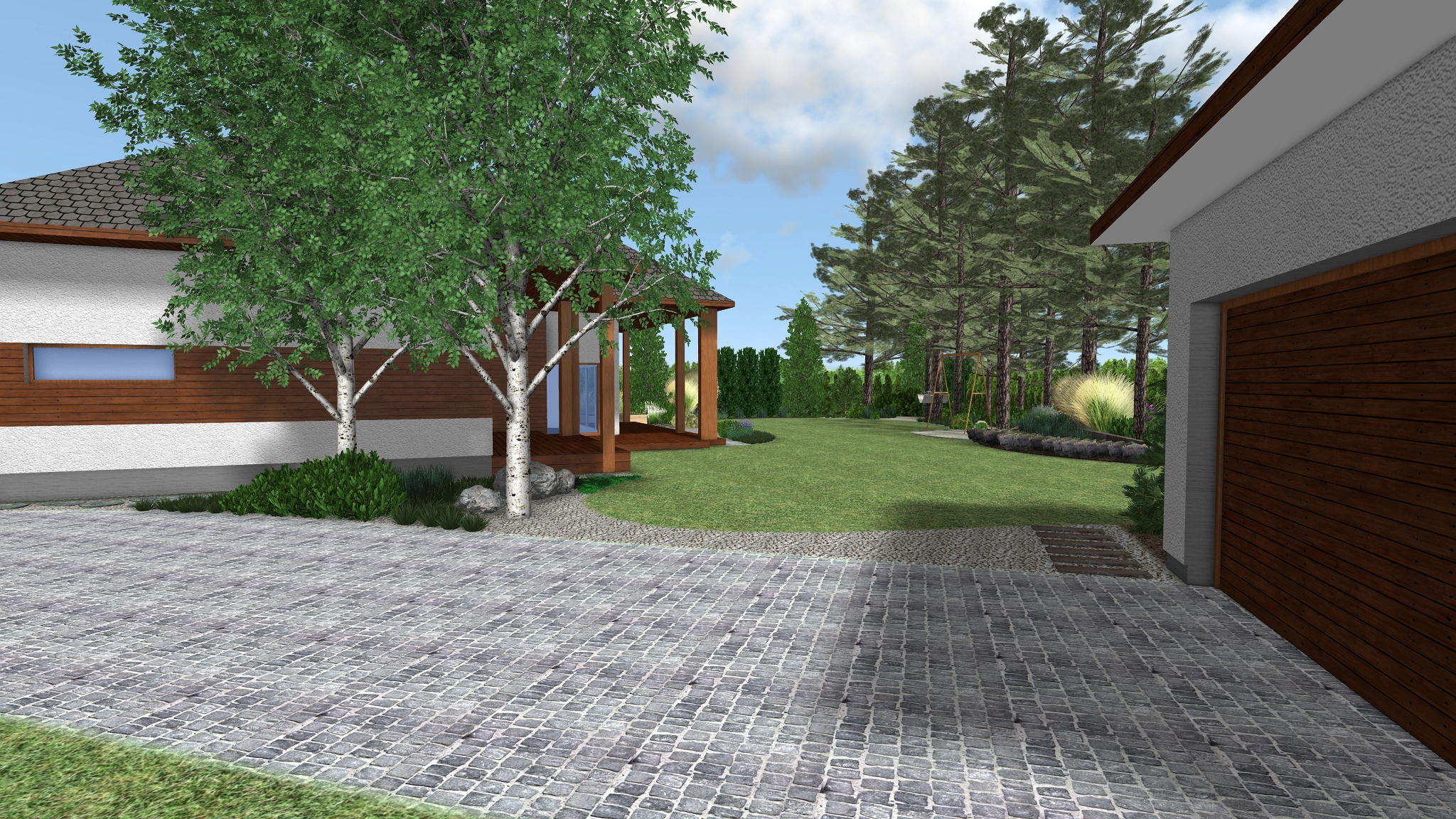 Projektovaná zahrada se vyznačuje hladkými liniemi oddělujícími prostor trávníku od linií záhonů s rostlinami a cest. Styl zahrady lze charakterizovat jako naturalistický, navazující na lesní výsadbu, kde dominantní roli hrají jehličnaté stromy, trávy a kvetoucí trvalky jako levandule a vřesy – rostliny, které nalezneme v polských lesích. Použité rostliny jsou většinou stálezelené, takže atraktivita zahrady nezmizí spolu s létem. Dům lemuje štěrková stezka, částečně přecházející v žulovou stezku, vyrobenou ze stejného materiálu jako vstupní cesta a stezka vedoucí ke vstupu do budovy. Lesní klima zahrady navazuje na obytný dům, jehož elevaci pokrývají z části dřevěné desky. Plot byl tudíž navržen ve stejném stylu. Šedé sloupky spojené dřevěnými prvky budou zajímavým prvkem zahradní architektury.