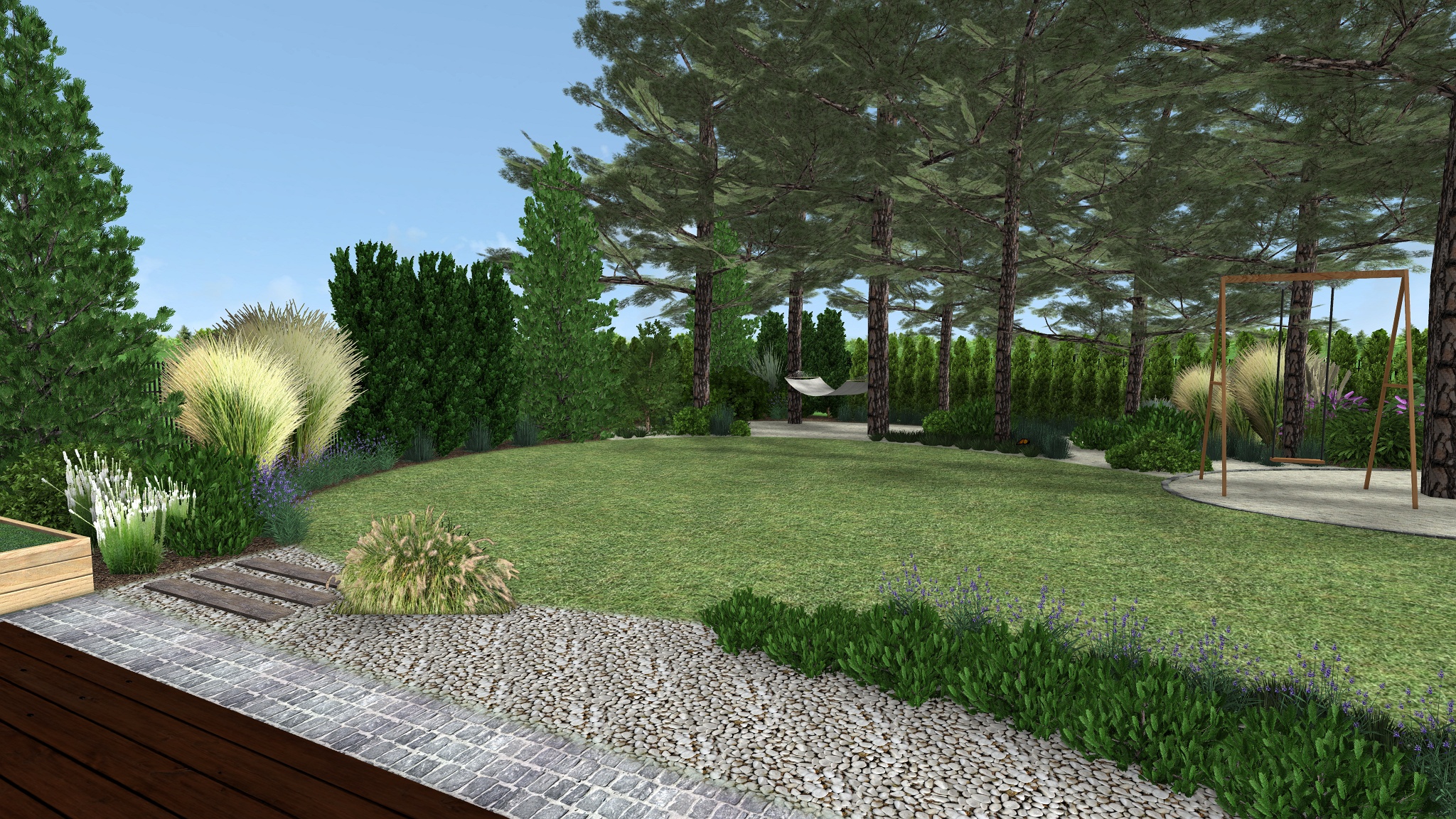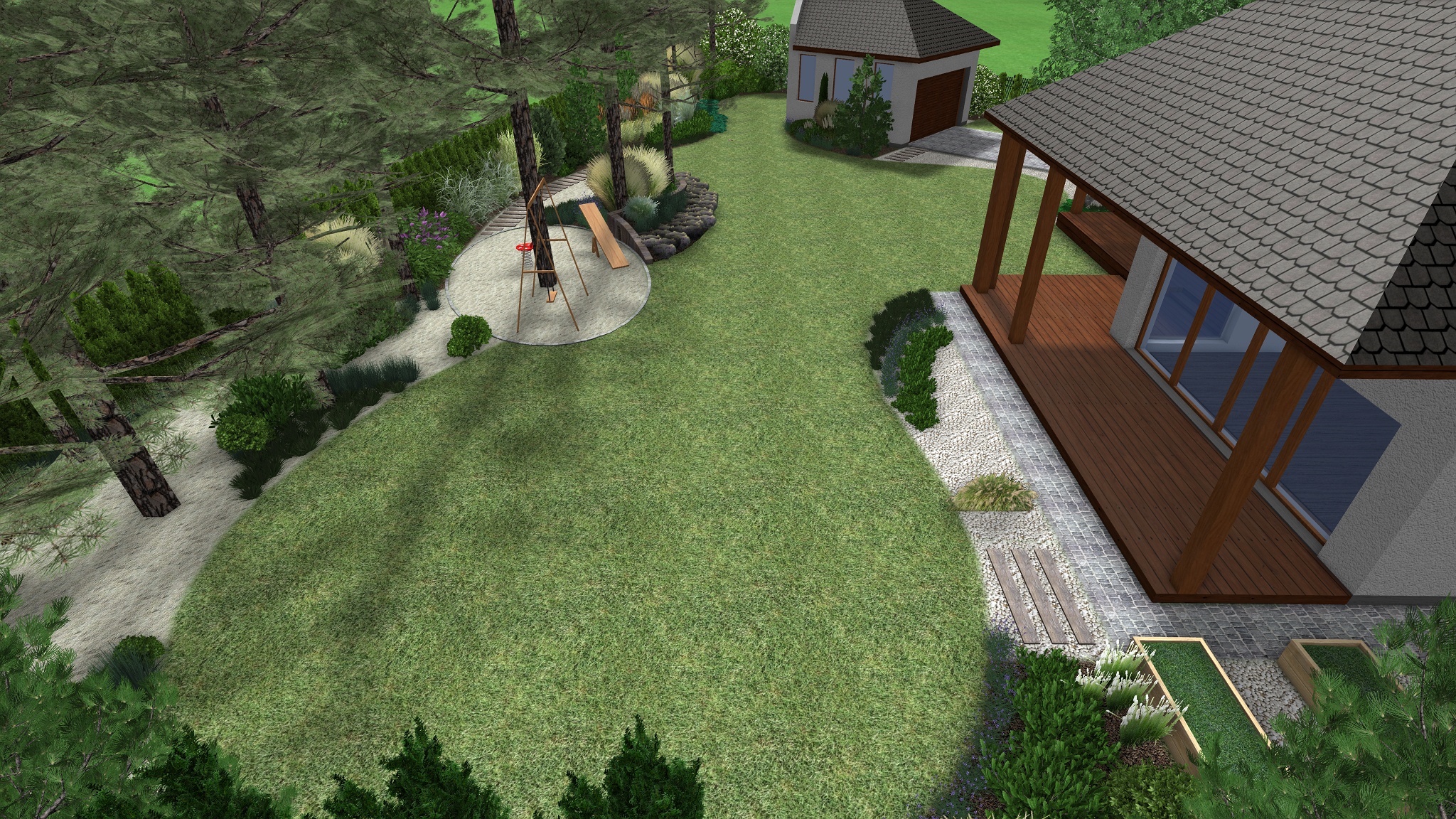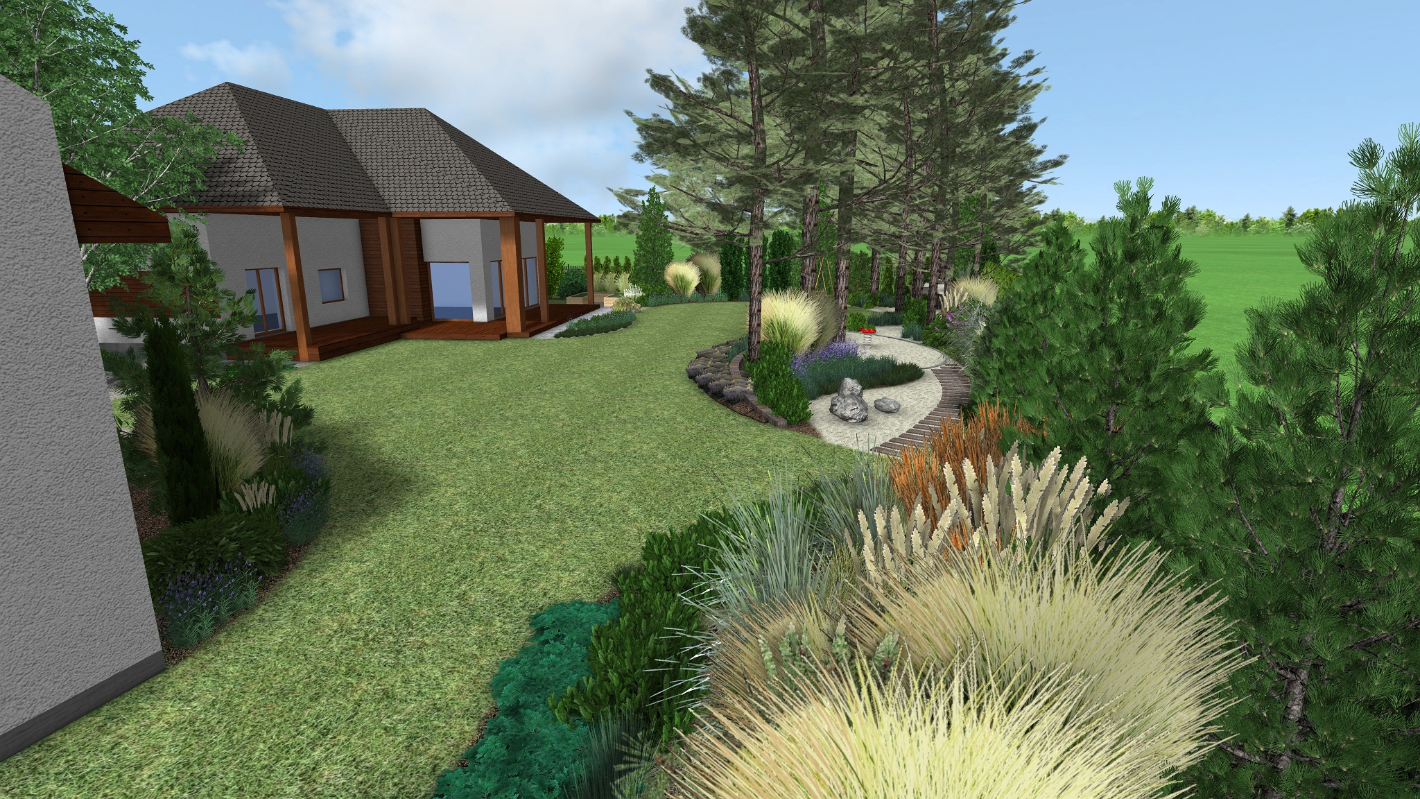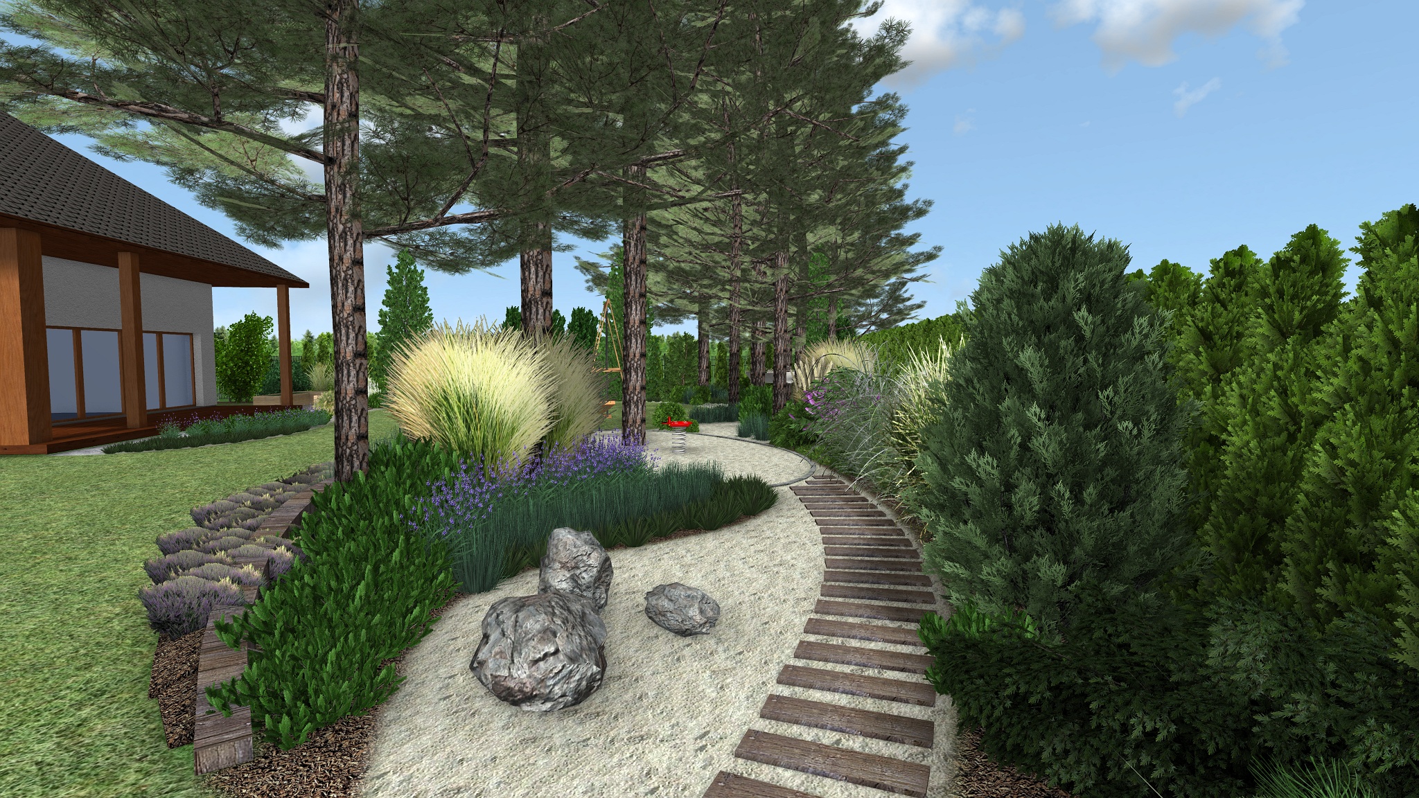 Za žulovým květináčem, podél plotu hraničícího s pozemkem sousedů byly vysazeny  vyšší jehličnaté stromy a keře doplněné trávami a levandulí – tvořící celoroční vizuální bariéru rekreační části zahrady.