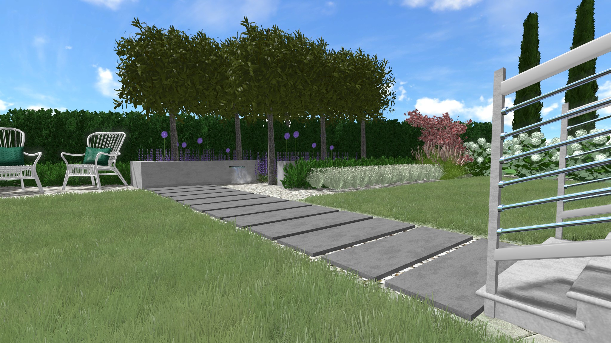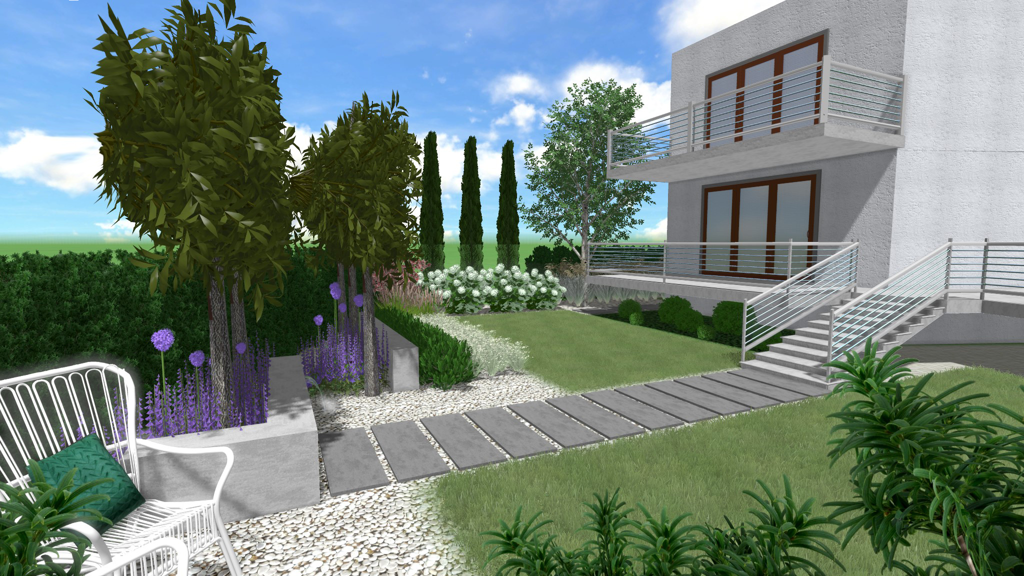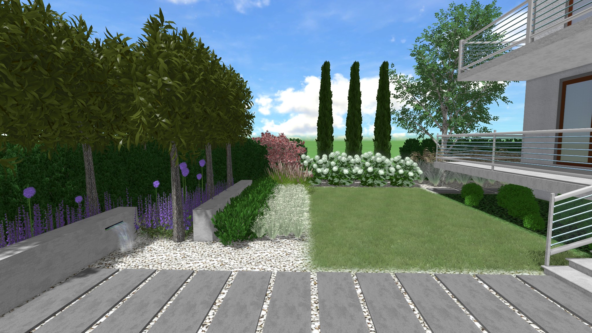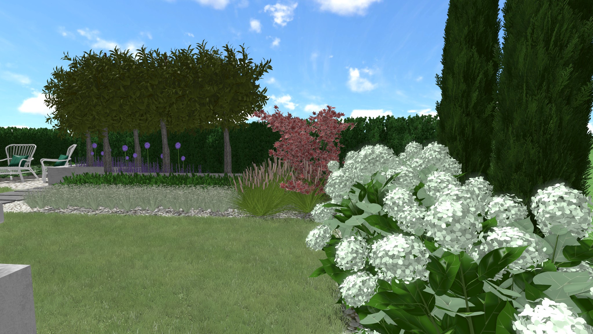 Rekreační oblast navržené zahrady začíná už od vrcholu domu, těsně za stezkou z betonových desek, vedle které se nachází velký rostlinný záhon. Jeho pozadí tvoří živý plot z tisu, obohacený v jedné části vysokými sloupovými smrky. Před živým plotem se nachází skupina okrasných rostlin. Hlavní část zahrady, nejvíce dekorativní, tvoří velký záhon ozdobený stěnami z betonových bločků omítnutých dekorativní omítkou imitující architektonický beton. Použití dekoračních stěn je skvělým způsobem, jak zavést moderní malou zahradní architekturu do malé zahrady. Na jedné ze stěn bude moderní vodní prvek v podobě výlevky z nerezové oceli. Tento prvek, který navrhli krajinní architekti, se velmi zalíbil investorům. Za zídkami budou vysazeny řádky z tvarovaného habru. A pod nimi trvalky kvetoucí bíle a fialově.