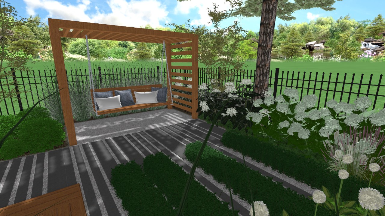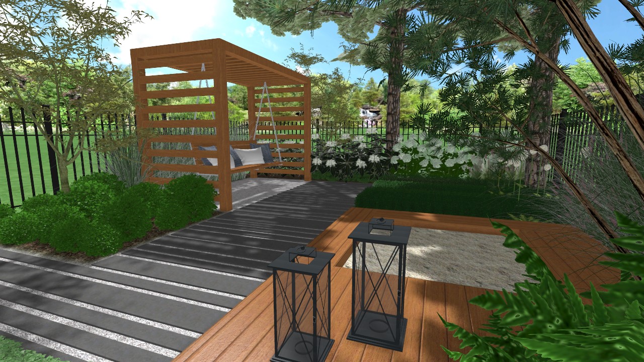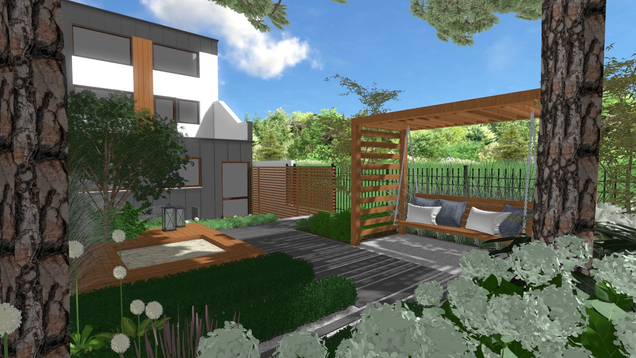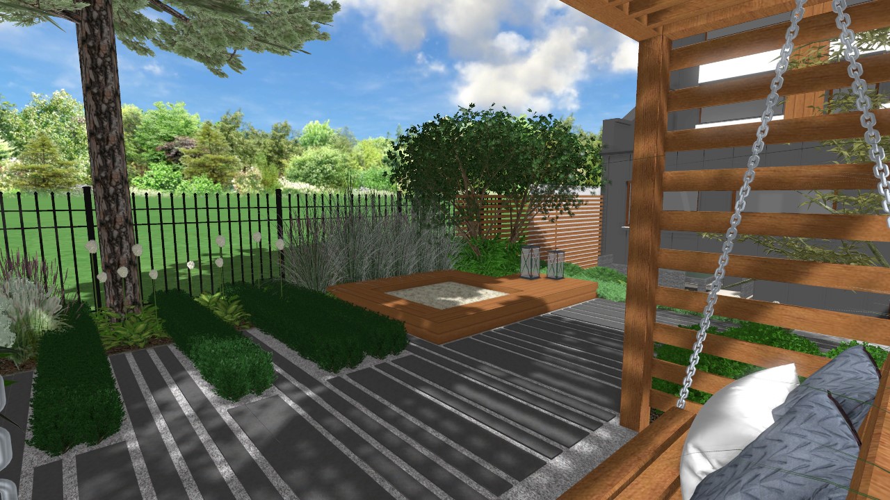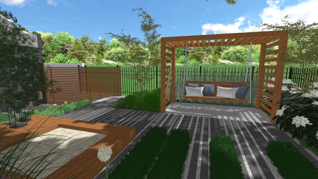 Projekt zahrady předpokládá vytvoření moderního prostoru, který by korespondoval s tvarem domu a jeho interiérem. Jedním z důležitějších prvků bylo postavení dvou-osobové houpačky určené k rekreaci a zábavě jak pro děti, tak pro dospělé. Byl zvolen architektonicky zajímavý tvar, jelikož v zahradách této velikosti bude mít nejen funkční, ale i dekorativní poslání, jelikož bude centrálním bodem projektu.