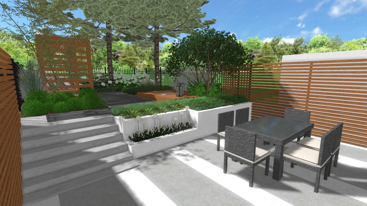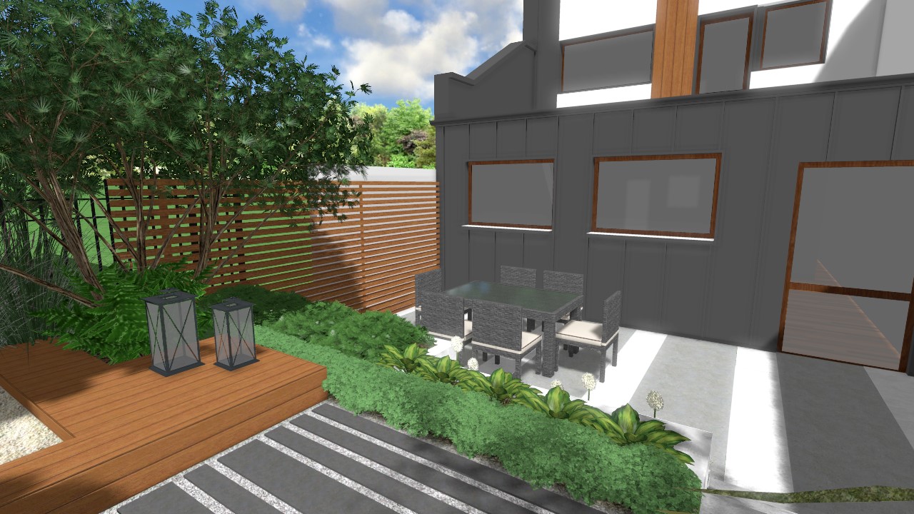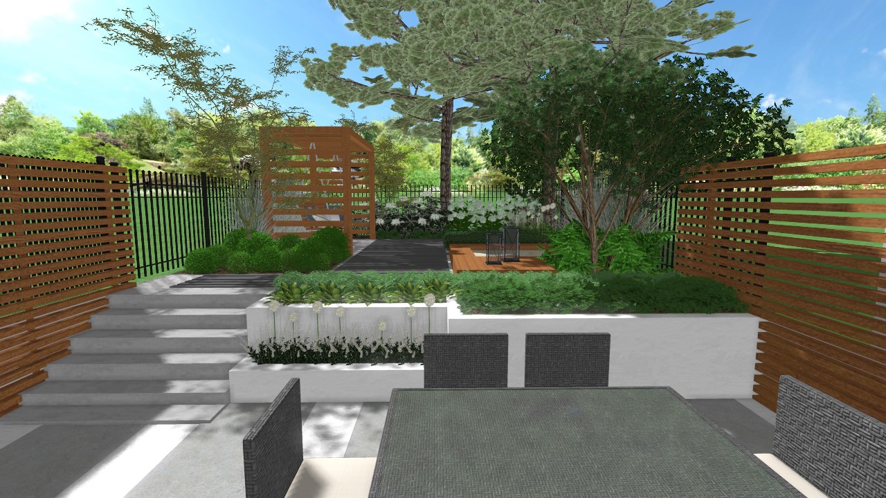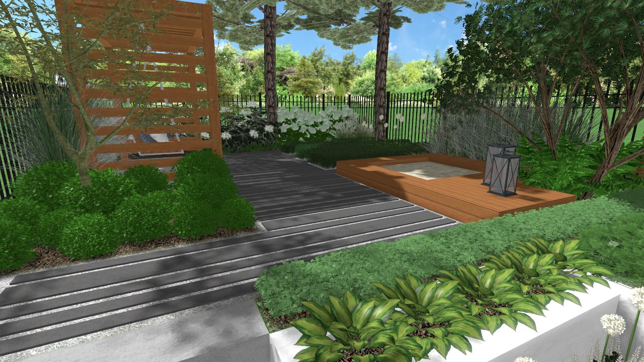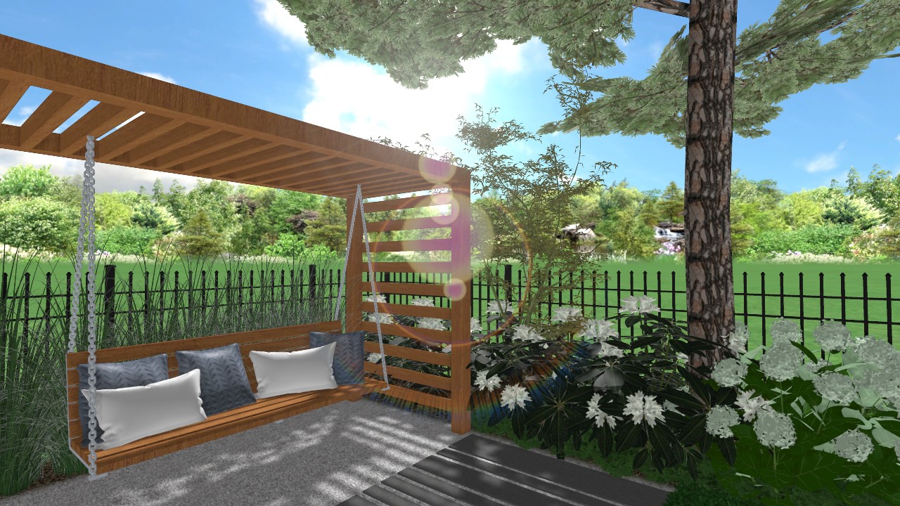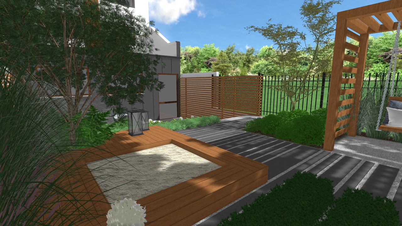 Projekt zahrady předpokládá vytvoření moderního prostoru, který by korespondoval s tvarem domu a jeho interiérem. Jedním z důležitějších prvků bylo postavení dvou-osobové houpačky určené k rekreaci a zábavě jak pro děti, tak pro dospělé. Byl zvolen architektonicky zajímavý tvar, jelikož v zahradách této velikosti bude mít nejen funkční, ale i dekorativní poslání, jelikož bude centrálním bodem projektu.