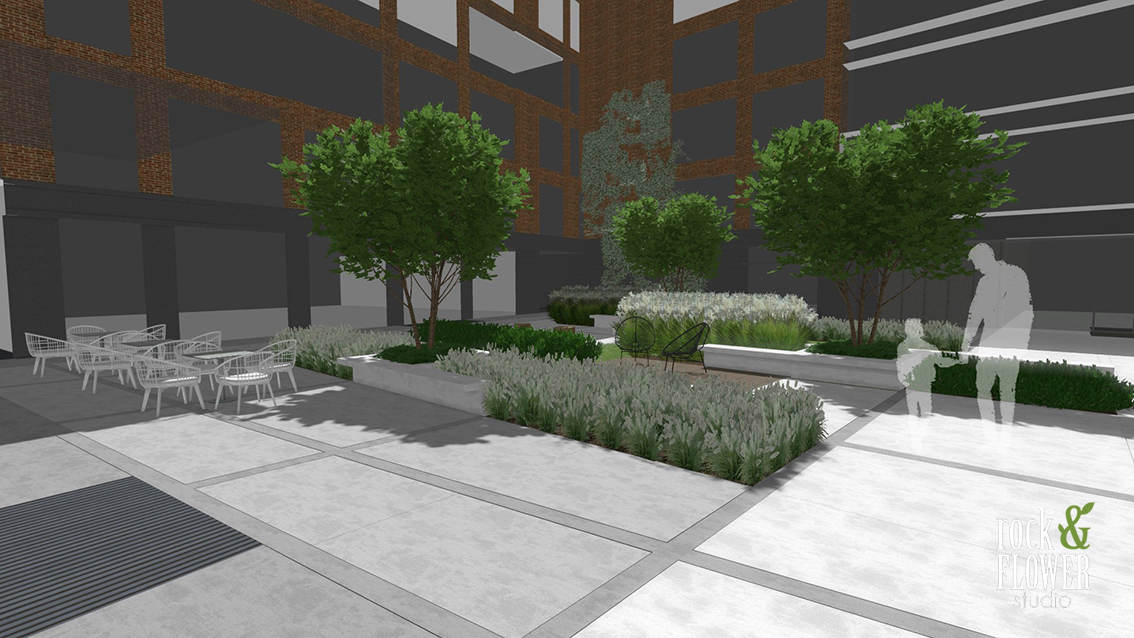 Konstrukce nádvoří a zeleně kolem kancelářské budovy GIANT OFFICE v Poznani představuje moderní koncept, který pasuje k architektuře budovy a současně souzní s ekologií oděnou v minimalistické rámy. Nádvoří plní funkce vizuální, nabízejíc zajímavý pohled z vchodů a oken kanceláří z každého patra, stejně jako funkce užitečné, díky řadě odpočinkových míst, která jsou zde rozmístěna. Kombinace surového betonového povrchu, betonových laviček a květináčů nebo hliníkových forem, malé architektury spolu s vegetací s měkkou texturou způsobí, že prostor ač velmi moderní láká k využití jak zaměstnance tak i návštěvníky. Originální formy navrženého nábytku dodají další – designerské kouzlo. Výchozím bodem pro vytvoření konceptu byl obdélník, rozmístěný v různých sekvencích ve formě květináčů, výsadby nebo trávníku, který se zařezává do povrchu, vytvářejíc zajímavou kompozici. Kombinace vegetace a dlažby byla vyvinuta tak, aby umožnila rychlou komunikaci po nádvoří.