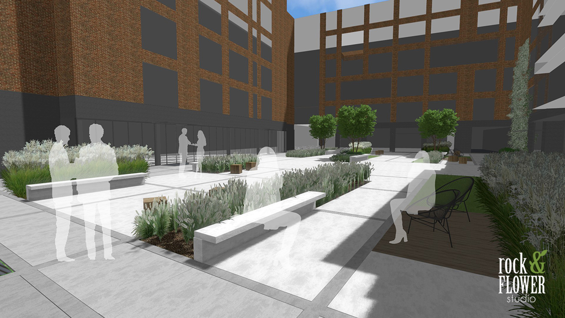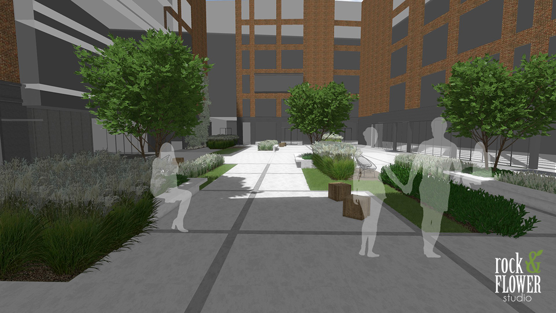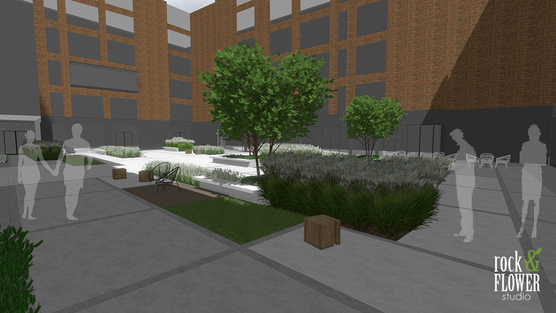 Prostor kolem budovy obsahuje vysokou zeleň – listnaté stromy, nižší – trávy a keře oblíbené ptáky či hmyzem, a nízkou, upravený trávník, který dodává moderní a lehký nádech okolí. Vnější část budovy i nádvoří jsou založeny na jednoduché formě rostlinných záhonů a použitých druhů, čímž vzniká souvislý moderní celek, který odráží charakter tohoto místa.
