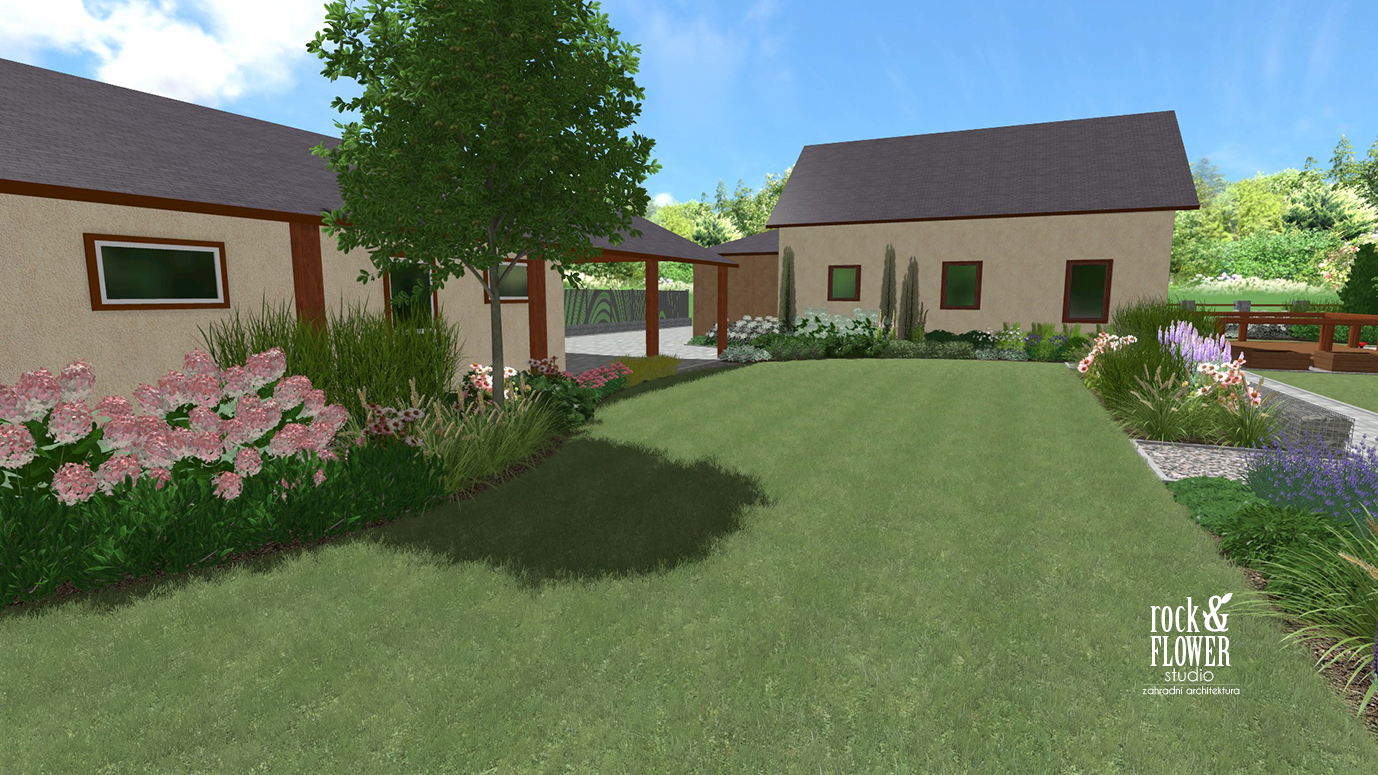 Pro vyrovnání utvrzených ploch byl zaveden trávník, jehož velikost je prakticky stejná jako terasa. Má elegantní geometrický tvar a z každé strany je obklopen stezkami. Před trávníkem – v blízkosti menší terasy u domu, bylo navrženo místo pro jednoduché dřevěné květináče na zeleninu a byliny.