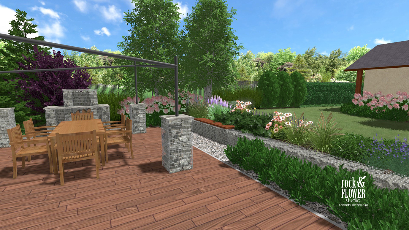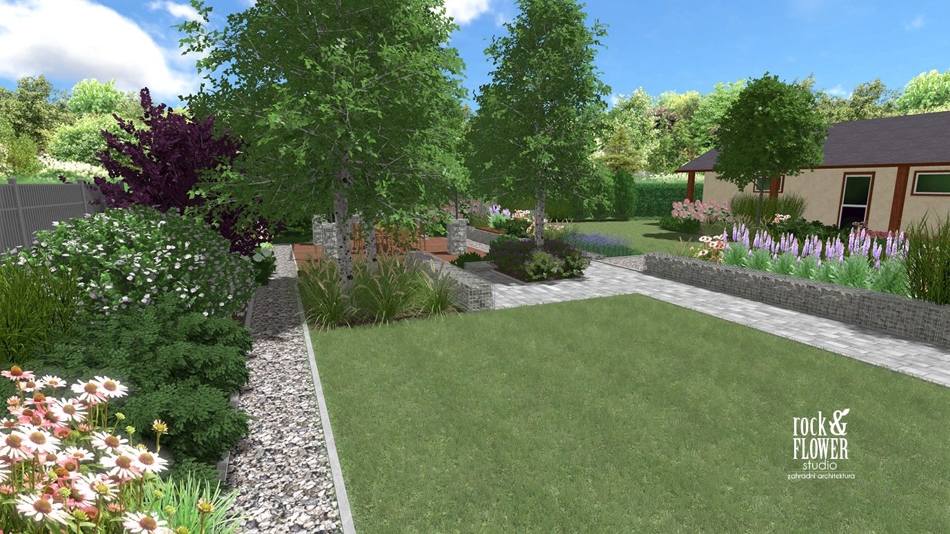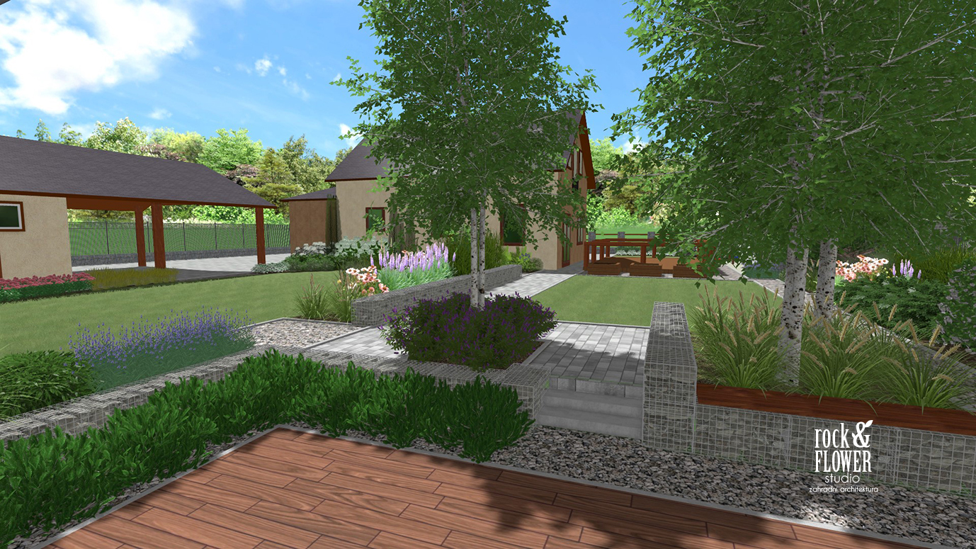 Na terasu s grilem nás vede stezka z té samé kostky, jaká se již nachází v zahradě. Na konci jsou místa pro listnaté stromy – himálajské břízy a nižší trávy. Vše je obklopeno gabionem.