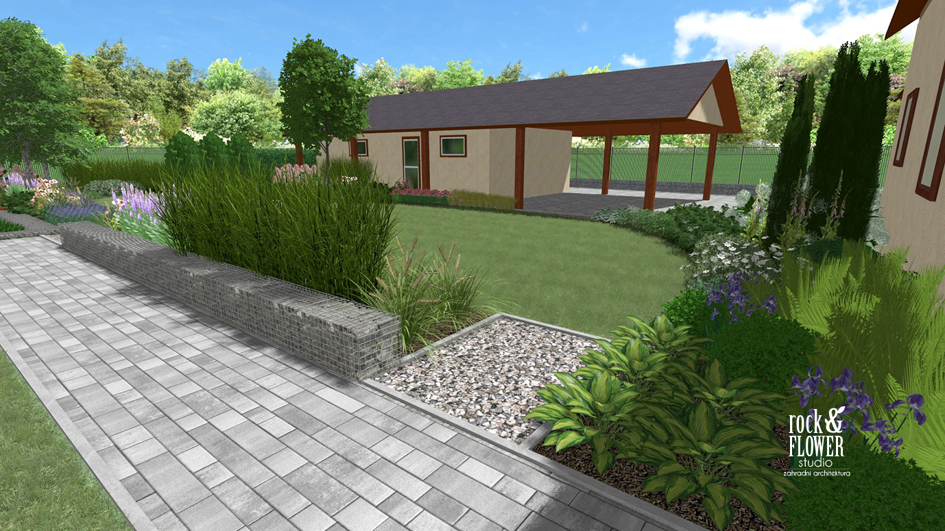 Před gabionem, který rozděluje zahradu na dvě části, je naplánováno množství trvalků. Jak již bylo řečeno, podél gabionu vedoucího na terasu se nachází velká skupina ozdobných trav, které vytváří pocit stěny. Zatím co dále, podél gabionu, který již existuje, je plánováno mnoho trvalků, které budou mít různé období kvetení. Mezi trvalkami jsou jehličnaté a listnaté keře.