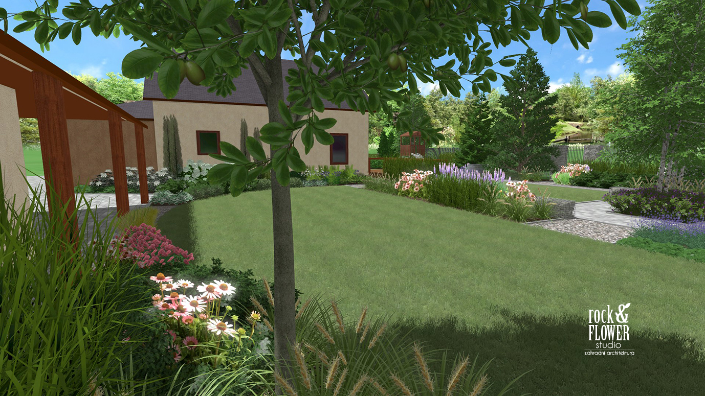 Zeleň v této části zahrady tvoří dekorativní trávy, listnaté keře a větší jehličnaté stromy. V jejich blízkosti budou rovněž ovocné keře, jako jsou maliny nebo borůvky.